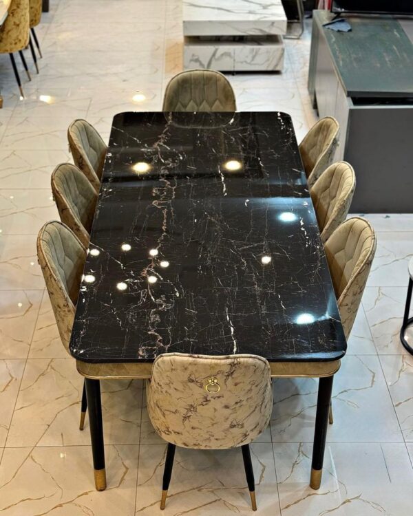 Skin Chairs & Black Dining Table Set: This elegant dining set combines the timeless appeal of sleek black with the luxurious texture of skin chairs. The black dining table features a smooth, matte surface with a minimalist design that complements a variety of interior styles, from modern to industrial. The sturdy table frame is crafted from high-quality wood or metal, ensuring durability and stability. Its sleek lines offer a sophisticated yet functional centerpiece for any dining area.